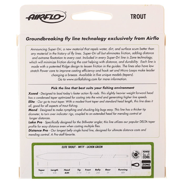 Une autre nouveauté de la gamme SuperDri d'Airflo est la "Zone Technology", un nouveau concept qui utilise un composé à faible compression dans la partie de la ligne exposée à la plus grande tension, garantissant que la ligne ne colle pas aux guides de la canne à pêche lors du halage et du tir. Cette nouvelle technologie de ligne minimise les frottements pendant le lancer, ce qui favorise la distance et prolonge la durée de vie de votre ligne flottante. Associé à l'arête révolutionnaire d'Airflo et au noyau de puissance, vous remarquerez la différence dès votre premier lancer.