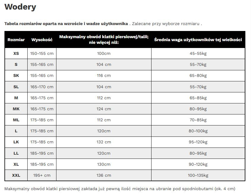 La circonférence maximale de la poitrine prend déjà en compte de la place pour des vêtements sous les waders (environ 4 cm)