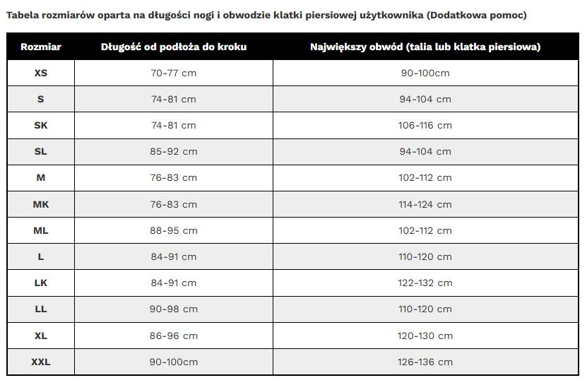 Tableau des tailles basé sur la longueur des jambes et la circonférence de la poitrine de l'utilisateur (aide supplémentaire)